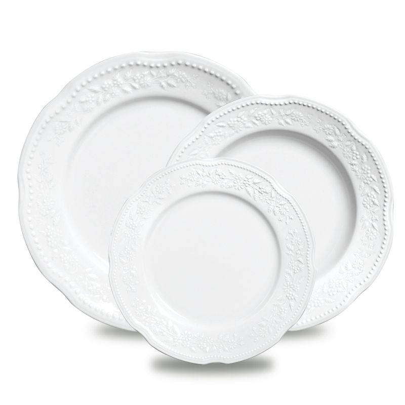 Design do aparelho de jantar com borda toda trabalhada em relevo, essencial para uma mesa posta com elegância.